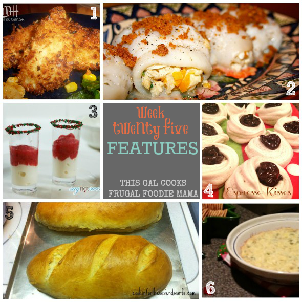 A few of my favorites:1. Coconut Chicken with Thai Sweet Chili Dipping Sauce by From The Kitchen of Mama Harris 2. Crab Stuffed Sole by Simple Living and Eating 3. Healthy Santa Shooters by Say Not Sweet Anne 4. Espresso Kisses by The Evas of Bellabini 5. Easy French Bread by Cookin for the Seven Dwarfs 6. Artichoke Dip with a Twist by Life In My Empty Nest